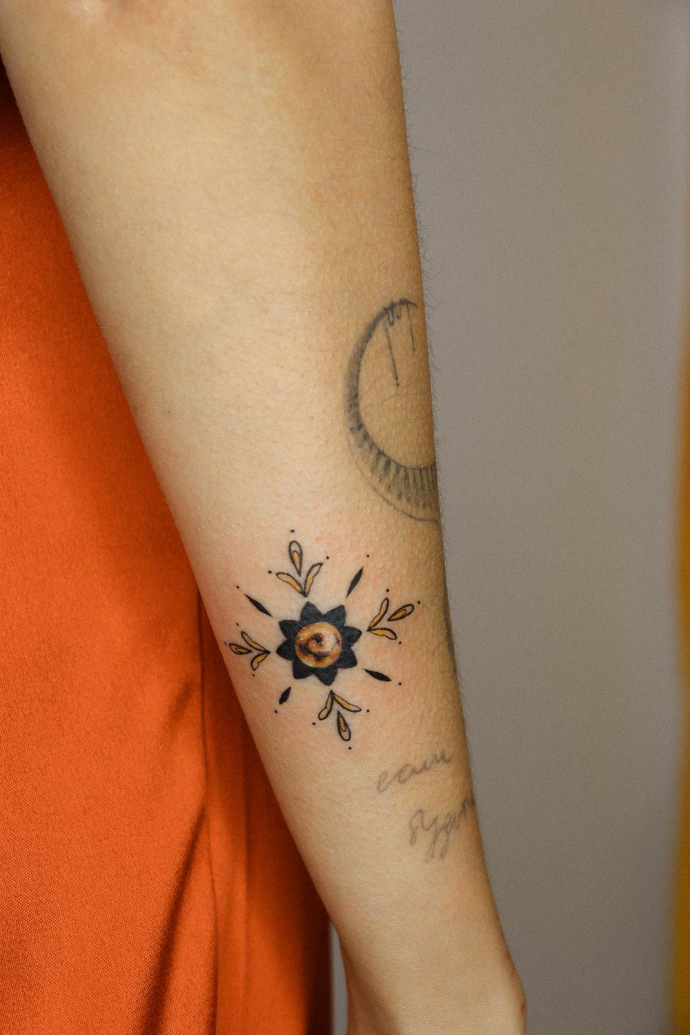 Жёлтый в татуировке – сложный цвет, из-за своего приближенного оттенка к цвету кожи. В зависимости от тона кожи он заживает более ярко или более бледно. Хорошо смотрятся татуировки с жёлтым, в которых есть поддержка другим цветом.